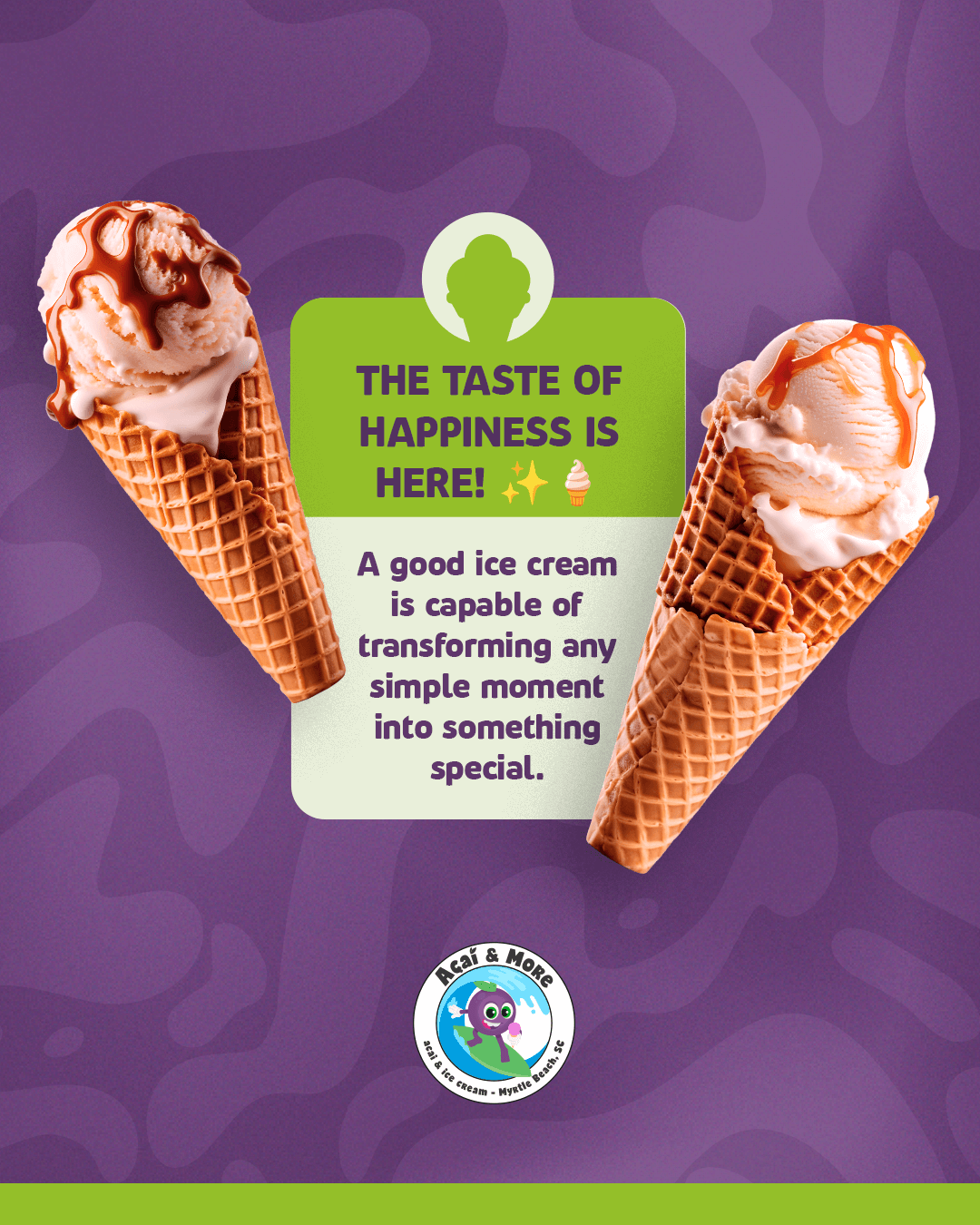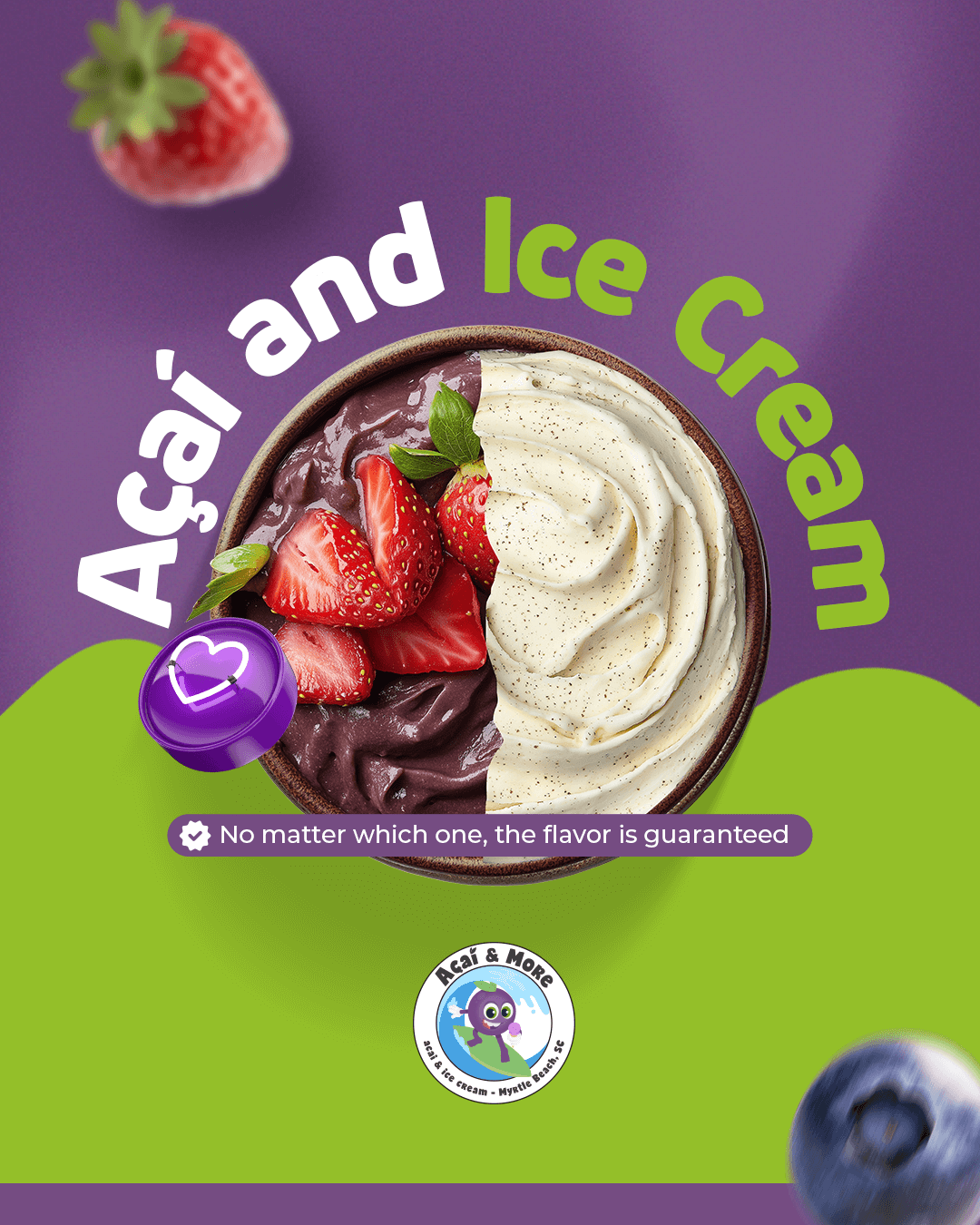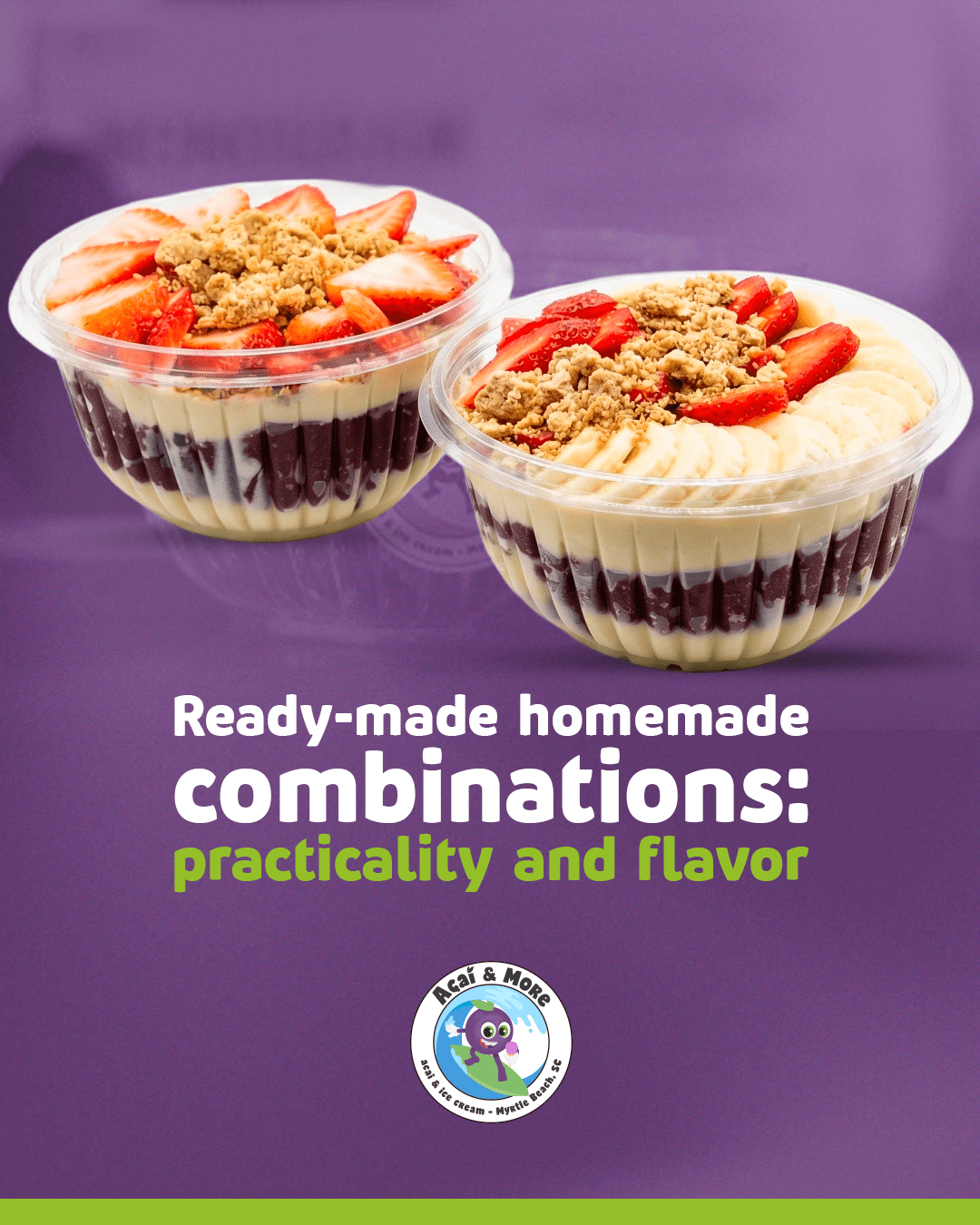 Whether it’s our creamy açaí topped with fresh fruits, crunchy granola, and superfood boosters, or a scoop of our irresistible ice cream in a variety of flavors, each option is made with care and quality so you can feel good while enjoying something extraordinary.